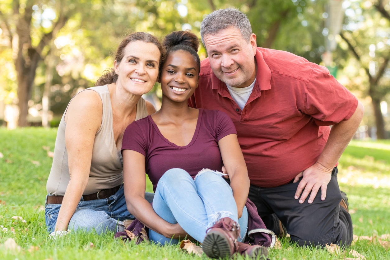 Smiling couple posing with their foster daughter sitting on the grass at a public park.